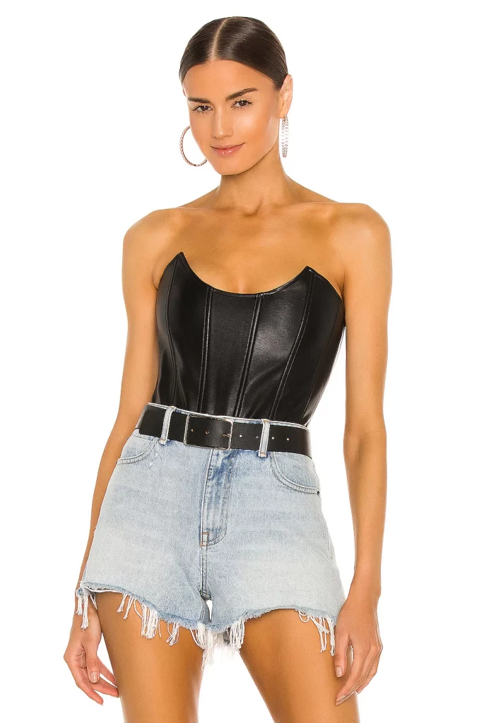 First of all I got this black leather corset which was an eye-catching product, it is a boned bodice .You can look at more faux leather options on revolve. It has lightly padded underwire cups. I wore it first .